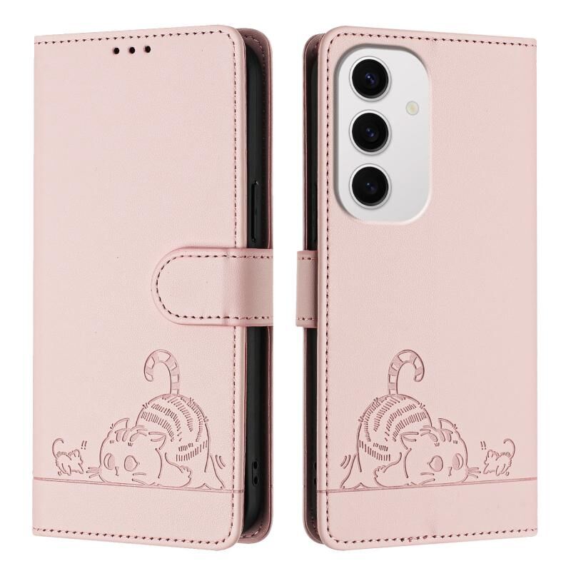 For Samsung Galaxy S24 FE 5G Cat Rat Embossed RFID Leather Phone Case with Lanyard(Pink)