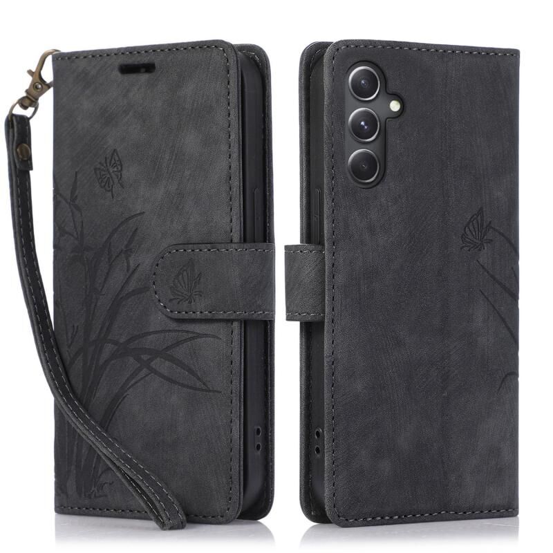 Θήκη τηλεφώνου από δέρμα με ανάγλυφο σχέδιο ορχιδέας πεταλούδας για Samsung Galaxy S24+ / S25+ 5G (Μαύρο)