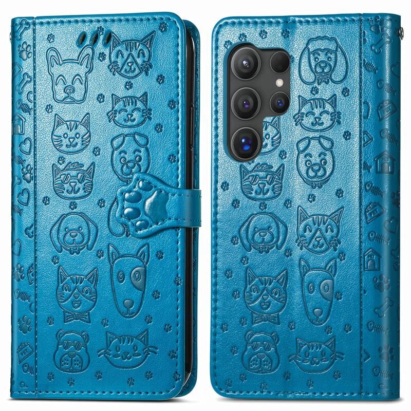 Θήκη τηλεφώνου Samsung Galaxy S24 Ultra 5G από δέρμα με ανάγλυφο σχέδιο γάτας και σκύλου (Χρυσό)