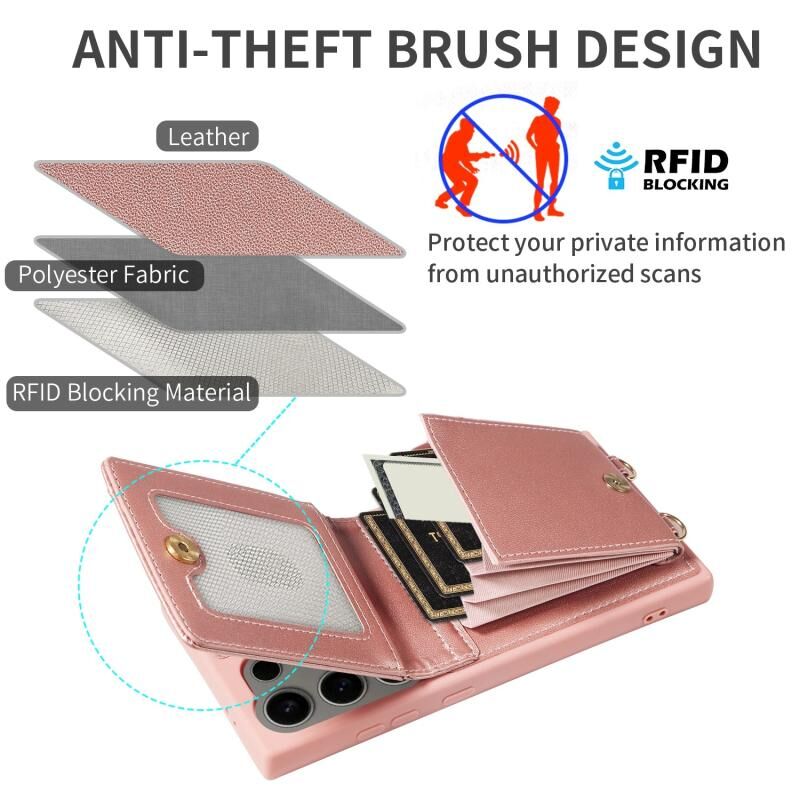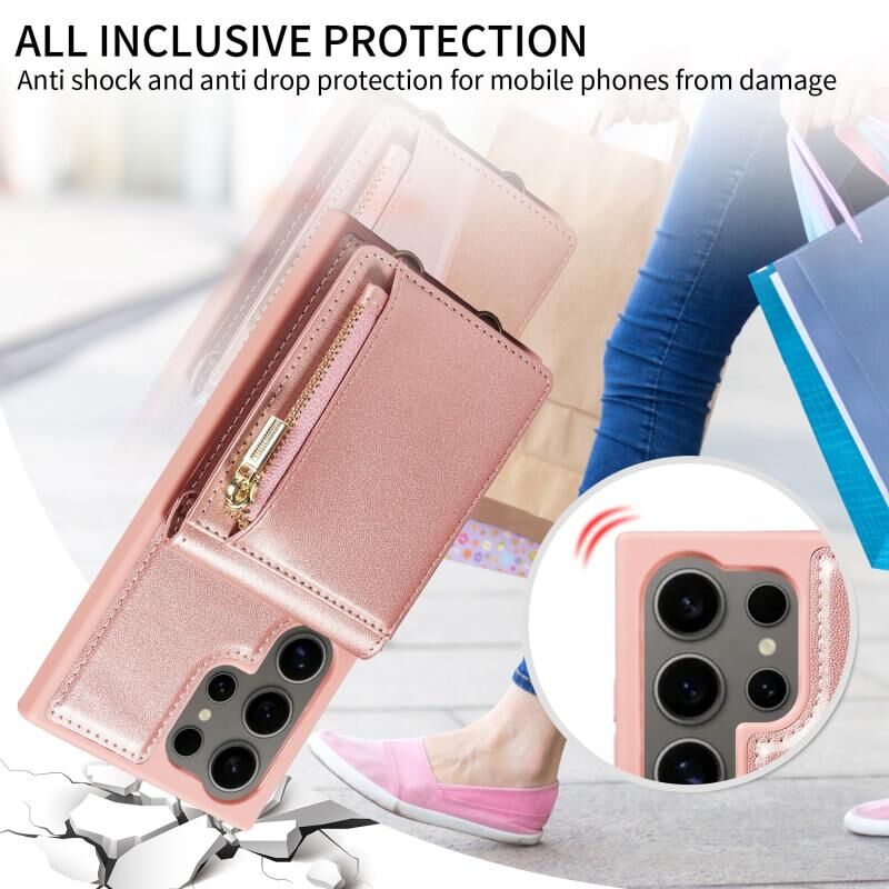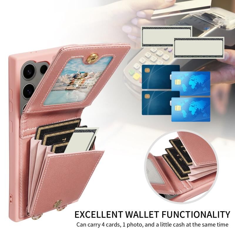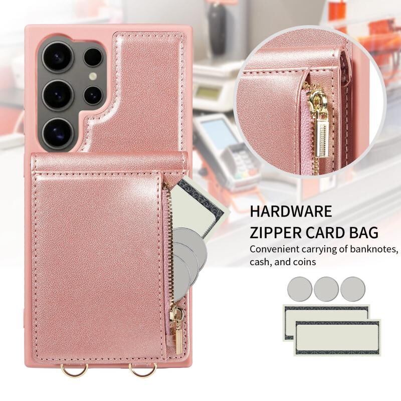 Για Samsung Galaxy S24 Ultra 5G Crossbody Lanyard φερμουάρ πορτοφόλι δερμάτινη θήκη τηλεφώνου (Rose Gold)