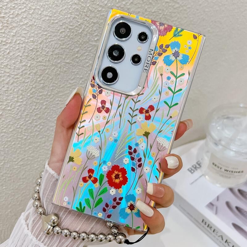 Θήκη τηλεφώνου για Samsung Galaxy S24 Ultra 5G με ηλεκτρολυτική επίστρωση, λουλούδι λέιζερ και λουρί καρπού (Λουλούδι AH6)
