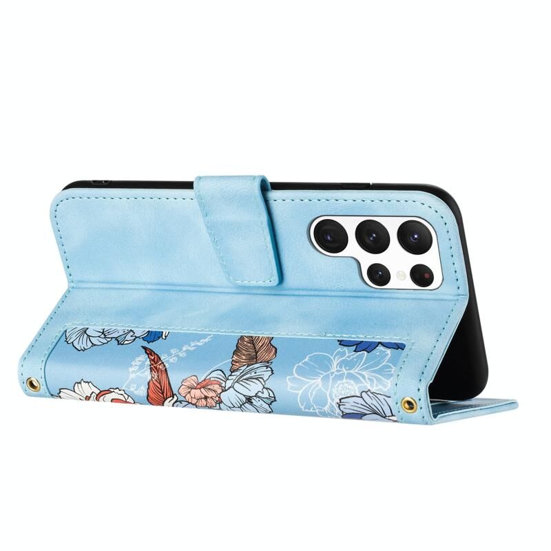 Θήκη τηλεφώνου Samsung Galaxy S24 Ultra 5G από δέρμα με λουλουδάτο σχέδιο και κορδόνι (Ανοιχτό Μπλε)