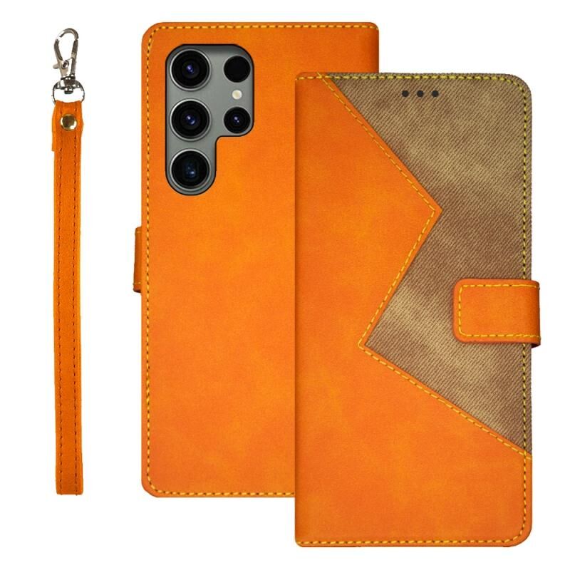 Θήκη τηλεφώνου δερμάτινη διχρωμίας για Samsung Galaxy S24 Ultra 5G idewei (Μπλε) (Πορτοκαλί)