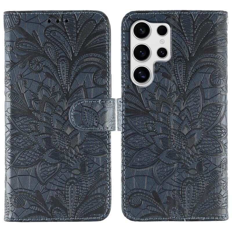 Θήκη τηλεφώνου Samsung Galaxy S24 Ultra 5G, δερμάτινη, τύπου flip, με ανάγλυφο σχέδιο δαντέλας λουλουδιών (Σκούρο μπλε)