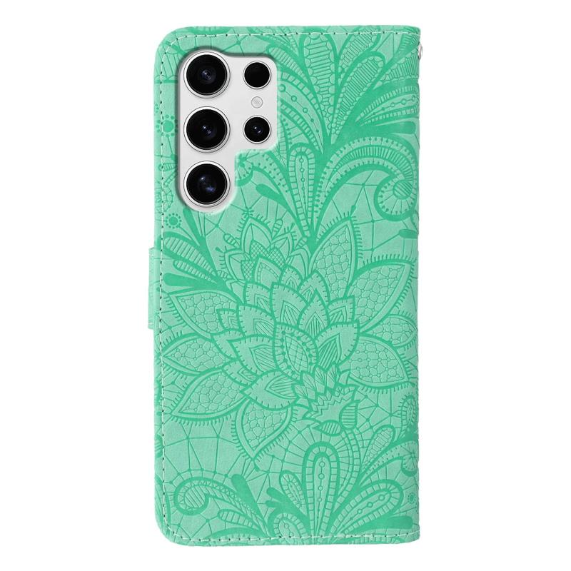 Θήκη τηλεφώνου Samsung Galaxy S24 Ultra 5G, δερμάτινη, τύπου flip, με ανάγλυφο σχέδιο δαντέλας λουλουδιών (πράσινο)