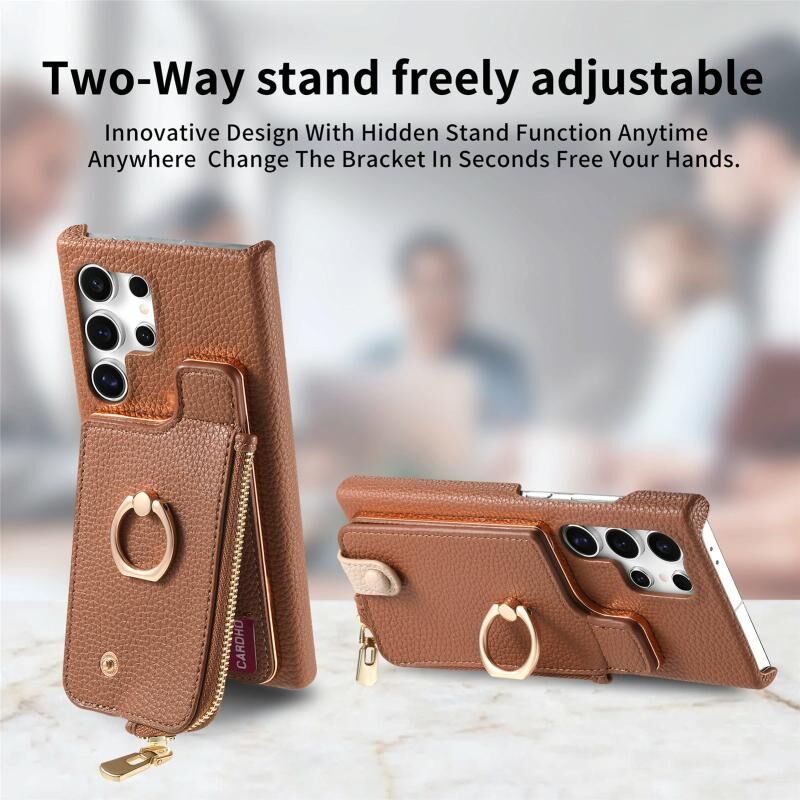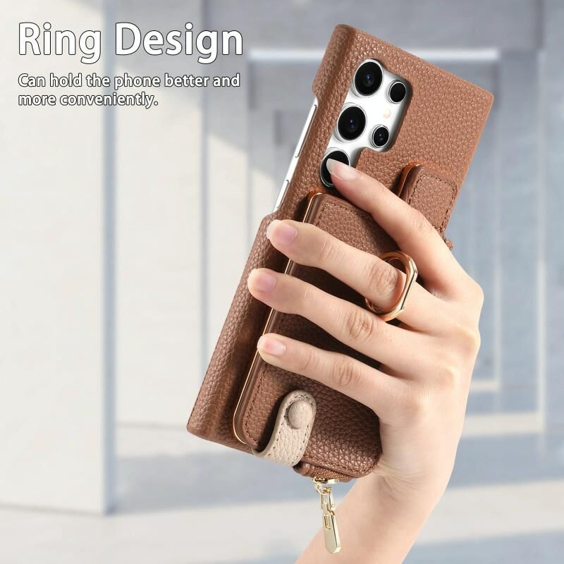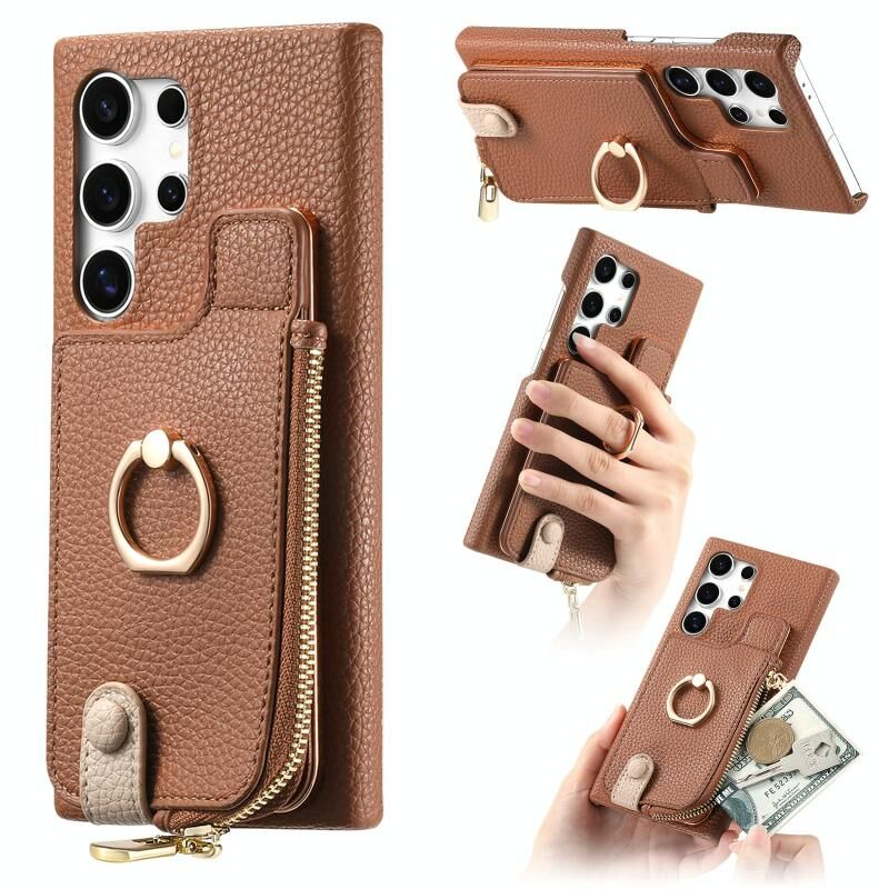 Για Samsung Galaxy S24 Ultra 5G Litchi δέρμα λάδι Edge δαχτυλίδι φερμουάρ πορτοφόλι πίσω υπόθεση τηλεφώνου (καφέ)