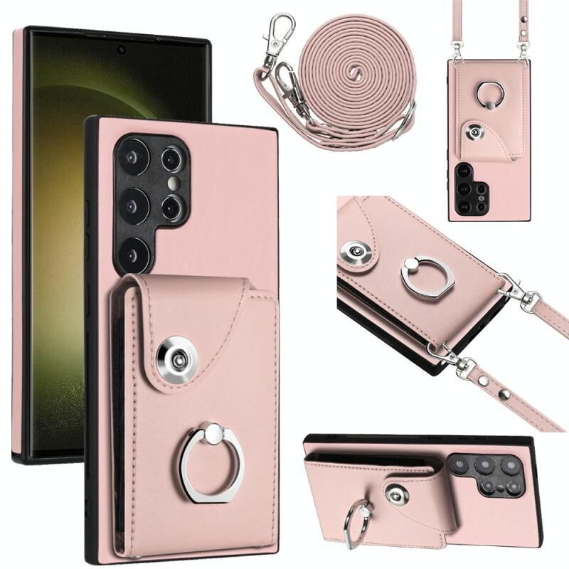 Για Samsung Galaxy S24 Ultra 5G Οργανική κάρτα τσάντα τσάντα δαχτυλίδι κάτοχος υπόθεση τηλεφώνου με μακρύ κορδόνι (ροζ)