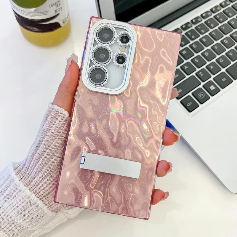 Για Samsung Galaxy S24 Ultra 5G επιμετάλλωση Glitter υφή Πτυσσόμενα κάτοχος TPU τηλέφωνο υπόθεση με φακό ταινία (ροζ ρυτίδες)
