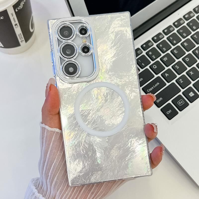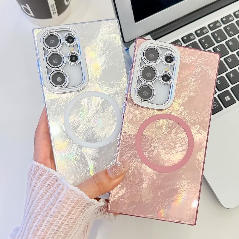 Θήκη τηλεφώνου TPU με υφή επιμετάλλωσης MagSafe για Samsung Galaxy S24 Ultra 5G με προστατευτική μεμβράνη φακού με γκλίτερ (Ροζ Ρυτίδες)