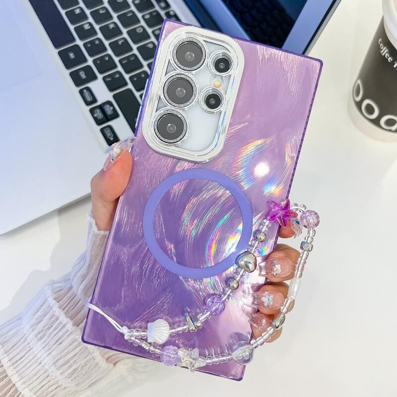 Θήκη τηλεφώνου Samsung Galaxy S24 Ultra 5G με υφή επιμετάλλωσης, βραχιόλι MagSafe, TPU και μεμβράνη φακού με γκλίτερ (Λευκά Κύματα Νερού)