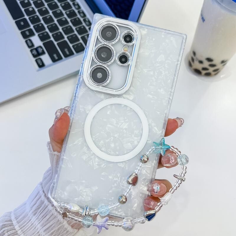 Θήκη τηλεφώνου Samsung Galaxy S24 Ultra 5G με υφή επιμετάλλωσης, βραχιόλι MagSafe, TPU και μεμβράνη φακού με γκλίτερ (Λευκά Κύματα Νερού)