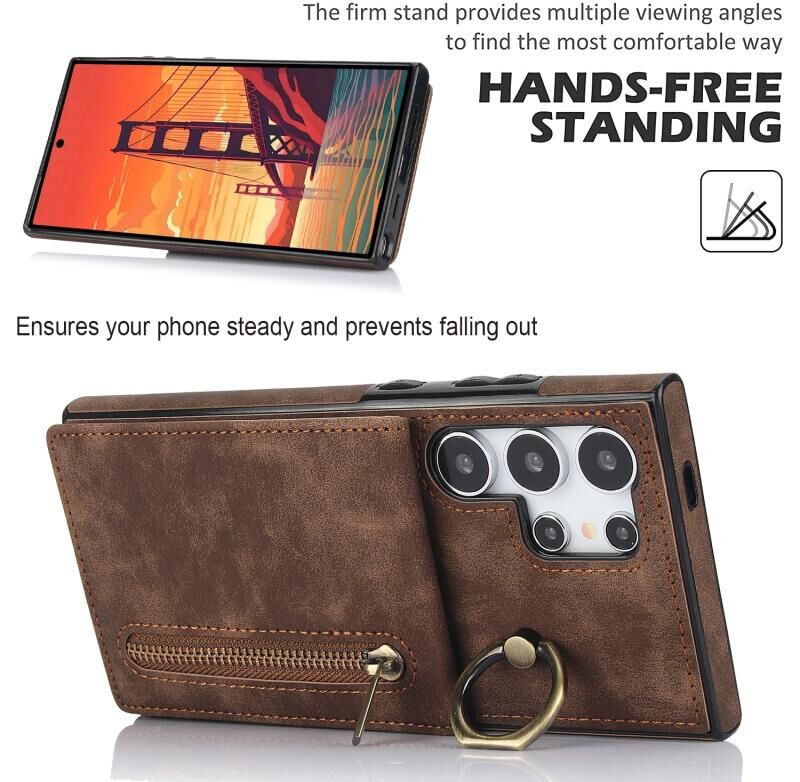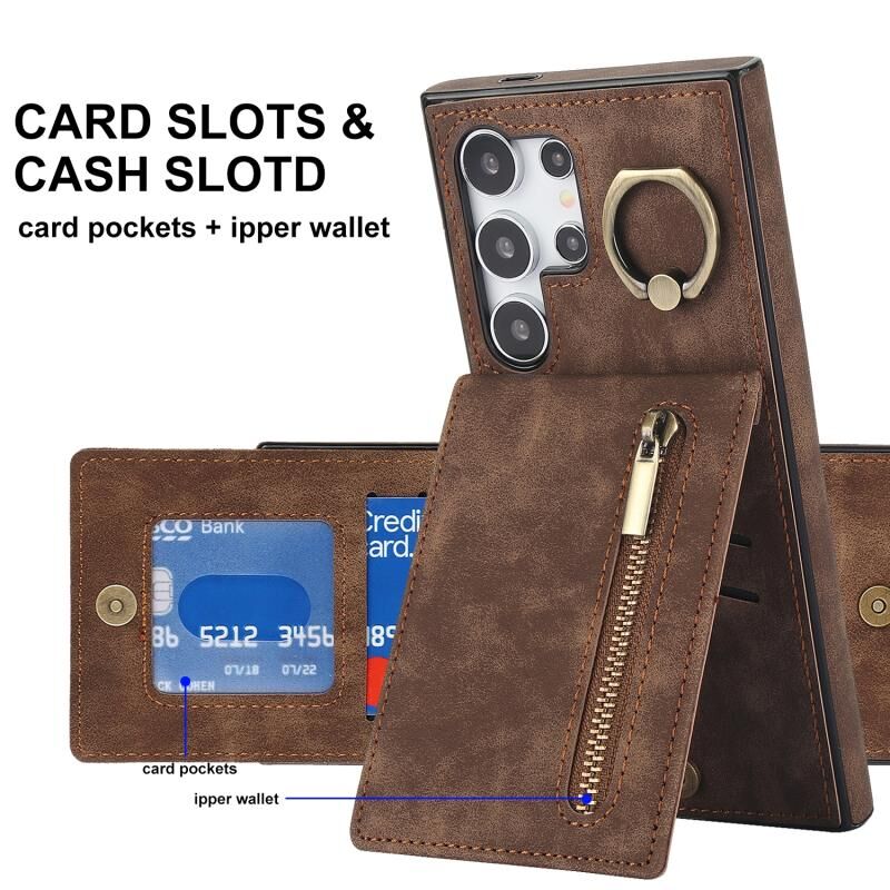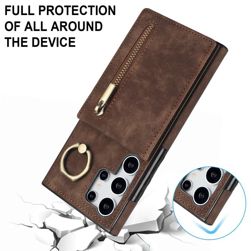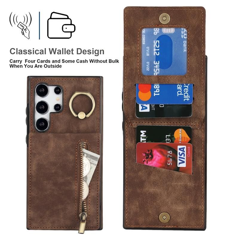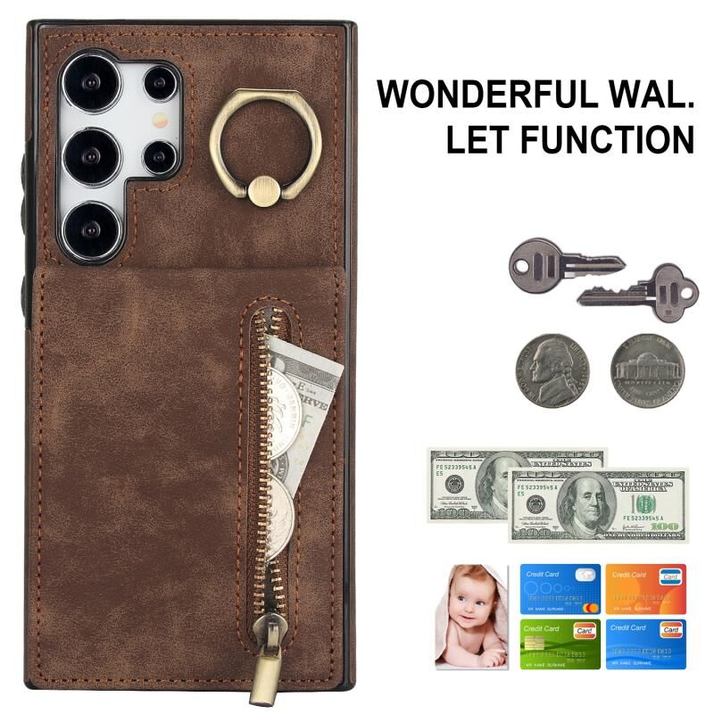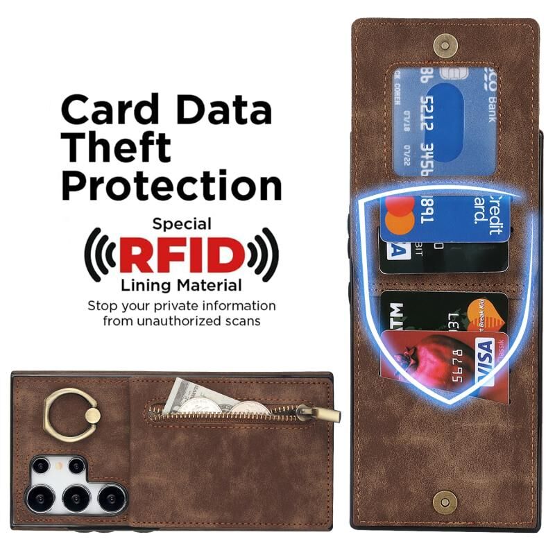 Για Samsung Galaxy S24 Ultra 5G ρετρό δαχτυλίδι και φερμουάρ RFID υποδοχή κάρτας υπόθεση τηλεφώνου (Καφέ)