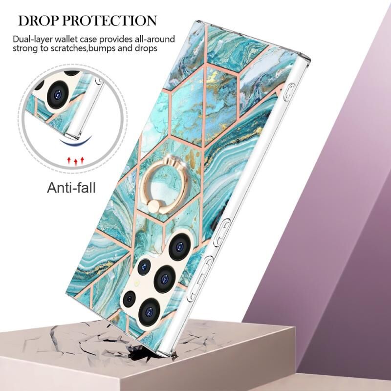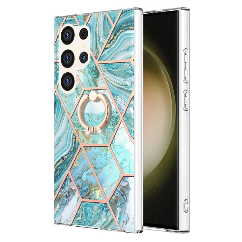Θήκη κινητού τηλεφώνου Samsung Galaxy S24 Ultra 5G, με σχέδιο μαρμάρου και λουλουδιών IMD TPU, με δακτύλιο στήριξης (Μπλε)
