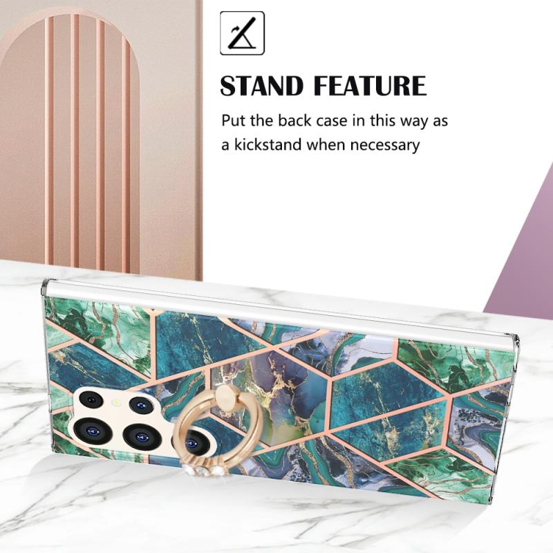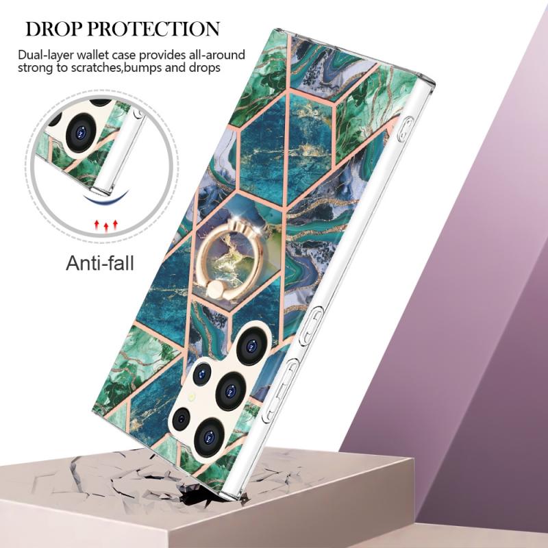 Θήκη κινητού τηλεφώνου Samsung Galaxy S24 Ultra 5G, με σχέδιο μαρμάρου και λουλουδιών IMD TPU, με δακτύλιο στήριξης (Μπλε πράσινο)