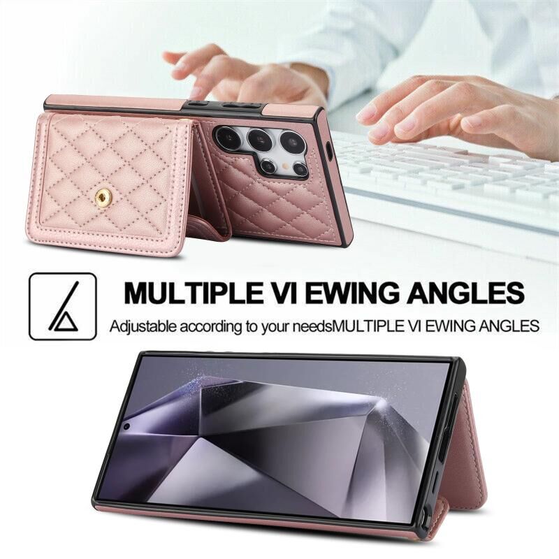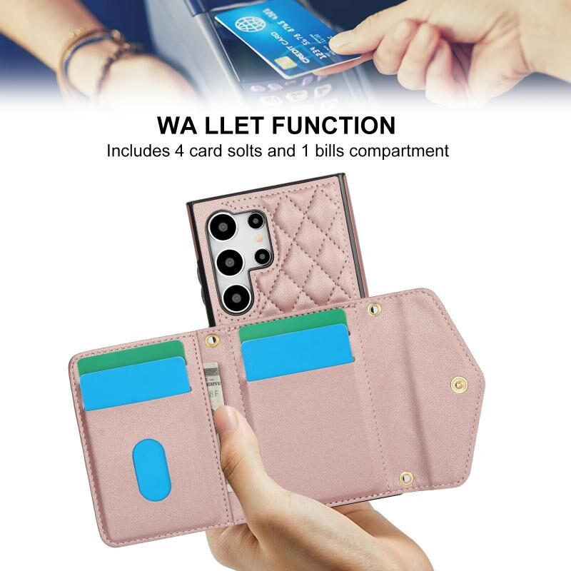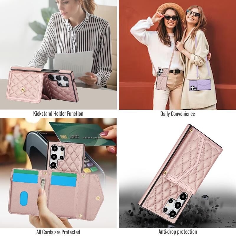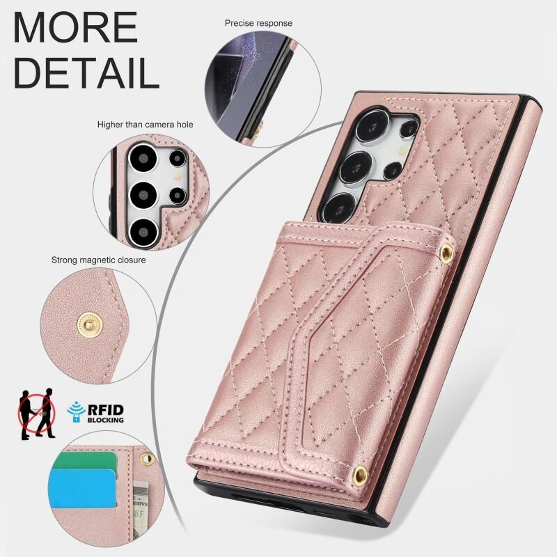 Για Samsung Galaxy S24 Ultra 5G Splicing Rhombic υφή κάρτα τσάντα υπόθεση τηλεφώνου με μακρύ κορδόνι (Ροζ χρυσός)