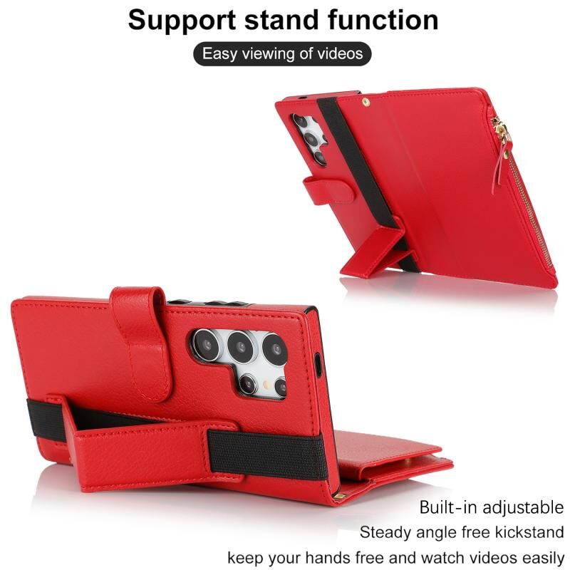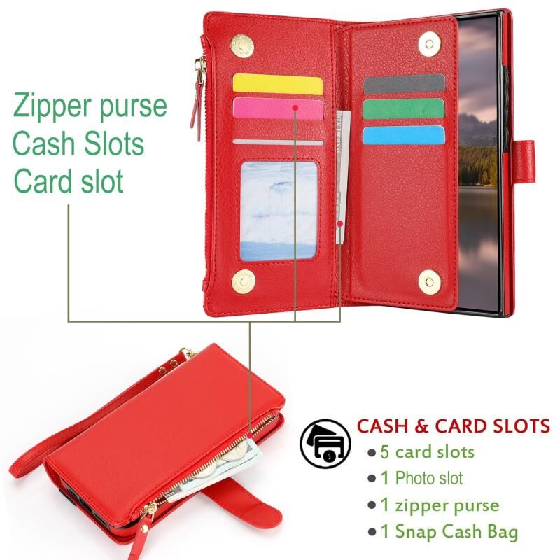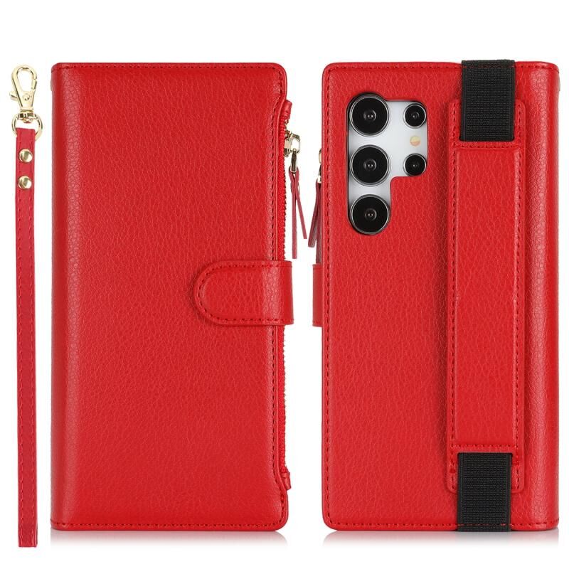 Για Samsung Galaxy S24 Ultra 5G Wristband κάτοχος φερμουάρ πορτοφόλι RFID δερμάτινη θήκη τηλεφώνου (Κόκκινο)