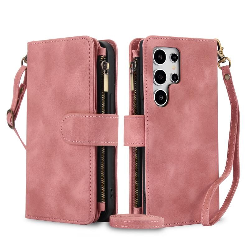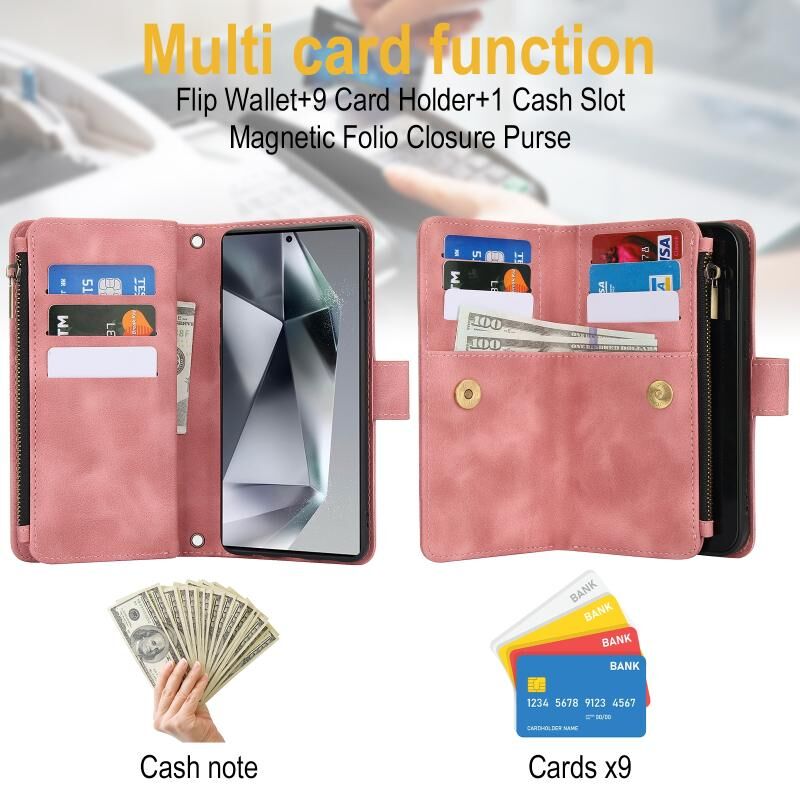 Για Samsung Galaxy S24 Ultra Dream 9-Card φερμουάρ πορτοφόλι RFID δερμάτινη θήκη τηλεφώνου με κορδόνι (Rose Gold)