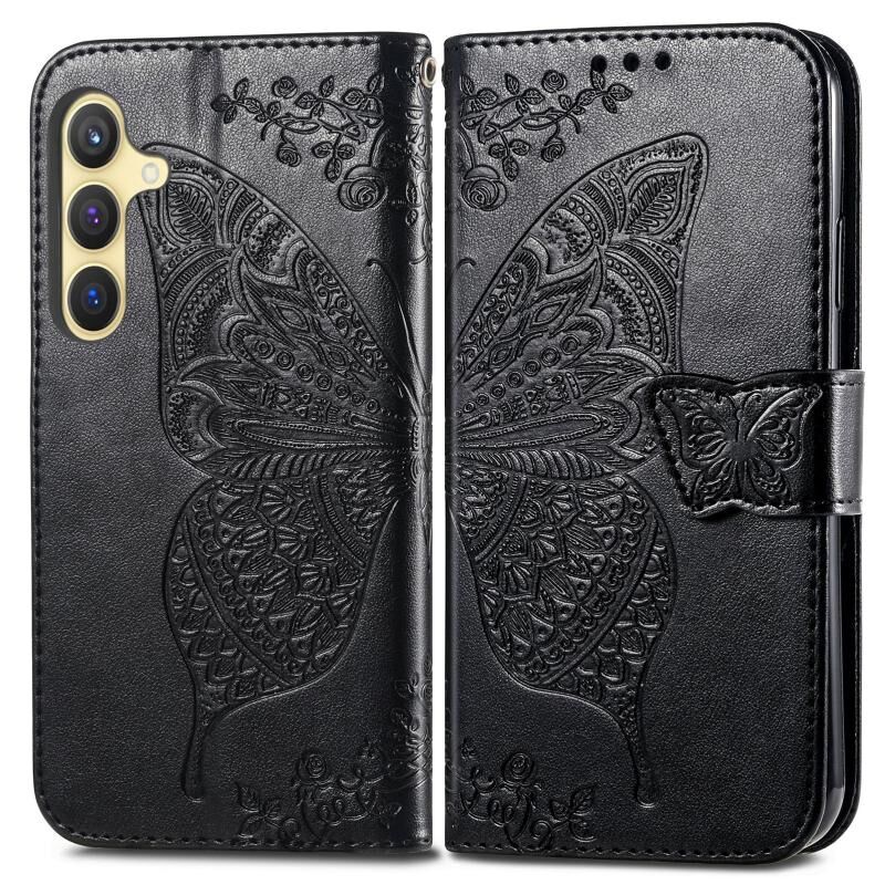 Θήκη τηλεφώνου Samsung Galaxy S25 5G, δερμάτινη με ανάγλυφο σχέδιο πεταλούδας και λουλουδιών (Μαύρο)