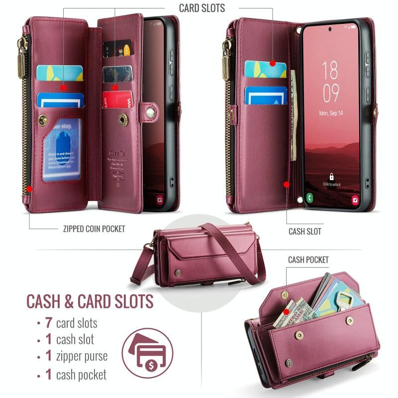 3. Άφθονος Χώρος Αποθήκευσης: Διαθέτει 10 θήκες για κάρτες, 1 θήκη για χρήματα, 1 θήκη με φερμουάρ και 1 τσέπη για χρήματα για εύκολη αποθήκευση. (Βασίζεται στην εικόνα)