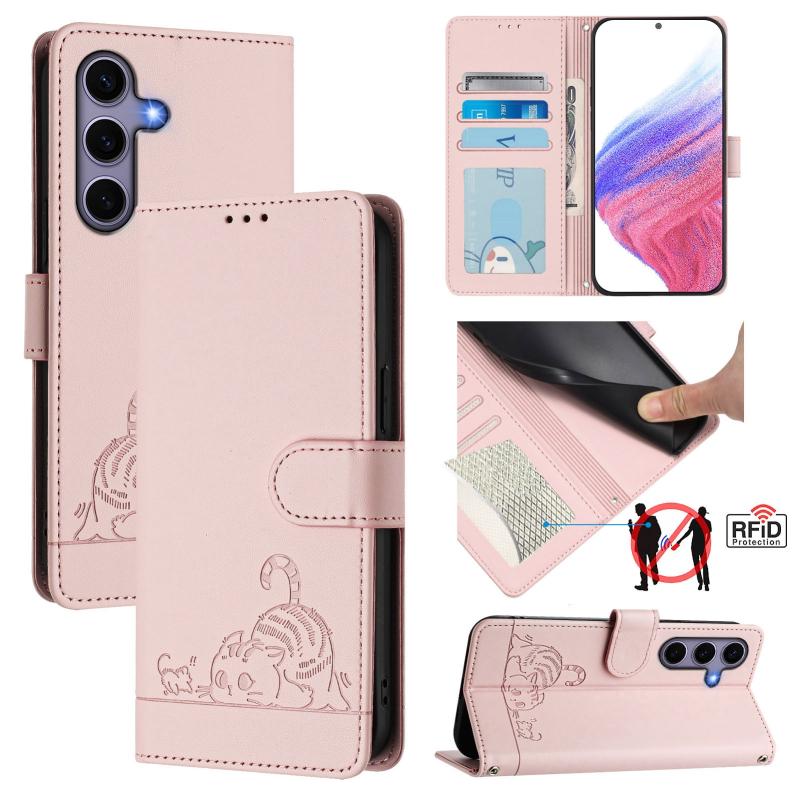 For Samsung Galaxy S25 5G Cat Rat Embossed RFID Leather Phone Case with Lanyard(Pink)