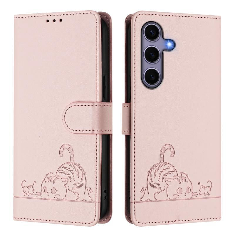 Θήκη τηλεφώνου Samsung Galaxy S25 5G με ανάγλυφο σχέδιο γάτας και ποντικιού, από δέρμα με τεχνολογία RFID και λουρί (Μέντας Πράσινο)