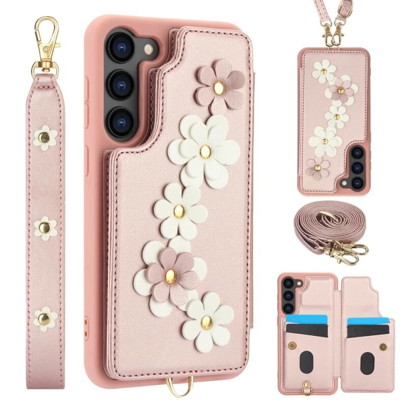 For Samsung Galaxy S25+ 5G Crossbody Flower Pattern Leather Phone Case(Rose Gold)