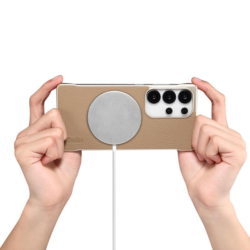 For Samsung Galaxy S25 5G Denior A20 Genuine Leather Litchi Texture MagSafe Frameless Phone Case(Khaki) (Denior)