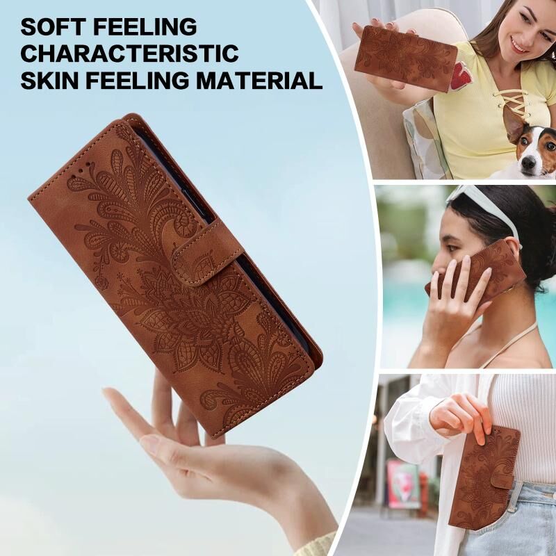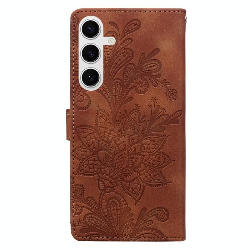 Θήκη κινητού τηλεφώνου Samsung Galaxy S25+ 5G από PU με μαγνητικό κούμπωμα, δαντελένια λουλουδάτα ανάγλυφα και λουρί καρπού (Καφέ)