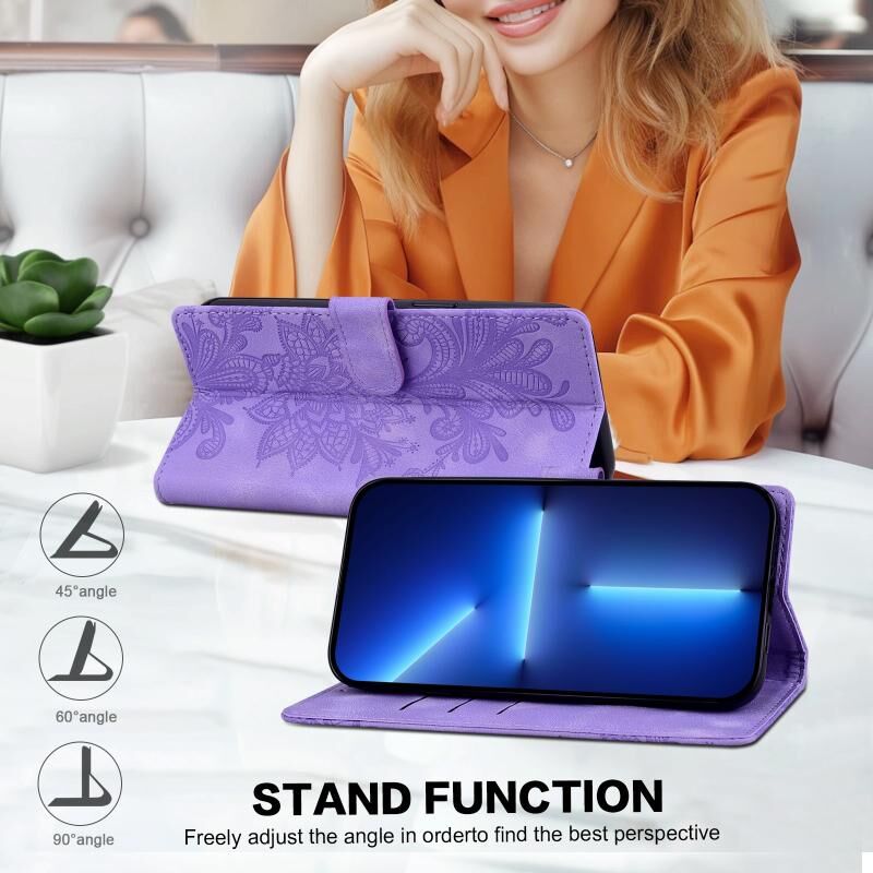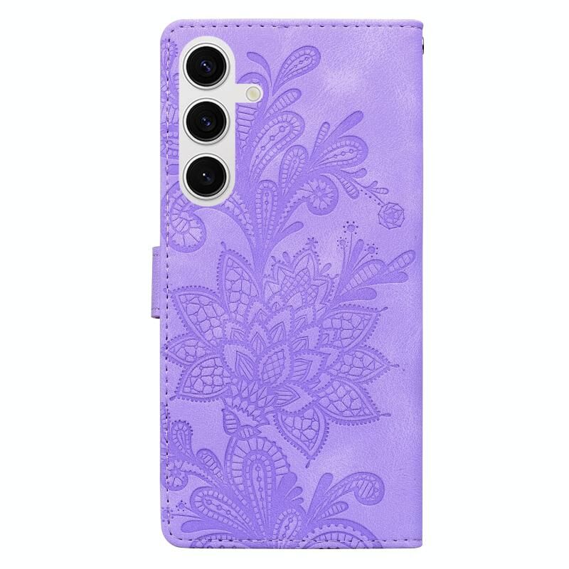 Θήκη τηλεφώνου Samsung Galaxy S25 5G από PU με δαντελένιο λουλουδάτο ανάγλυφο και μαγνητικό κούμπωμα, με λουρί καρπού (Μωβ)