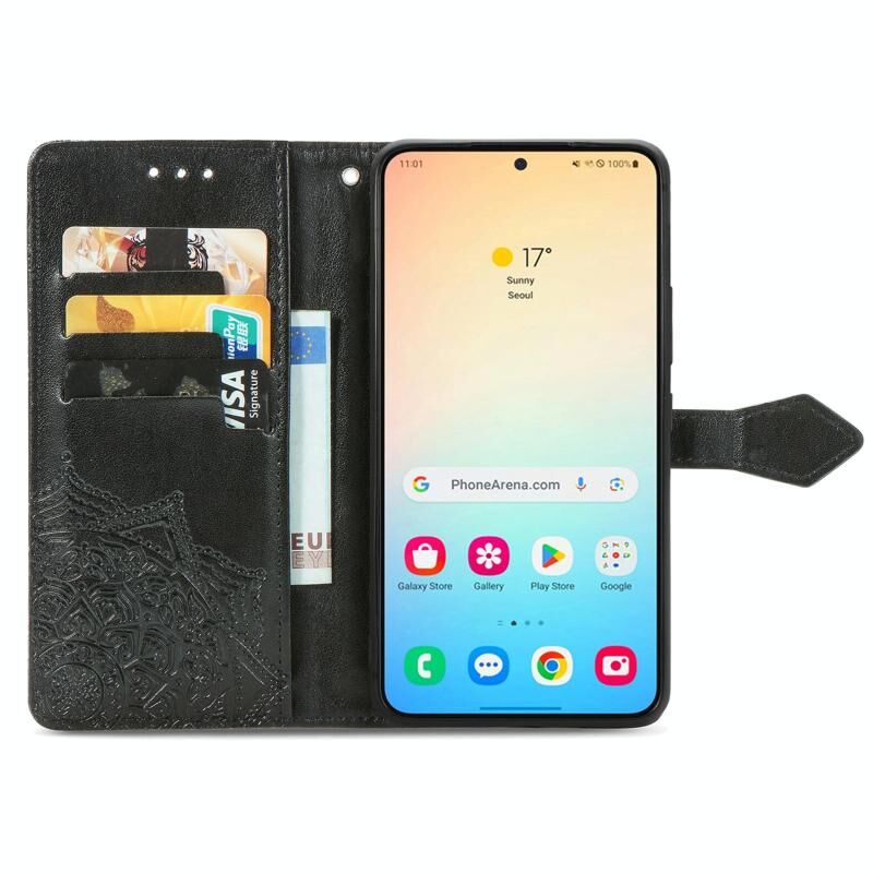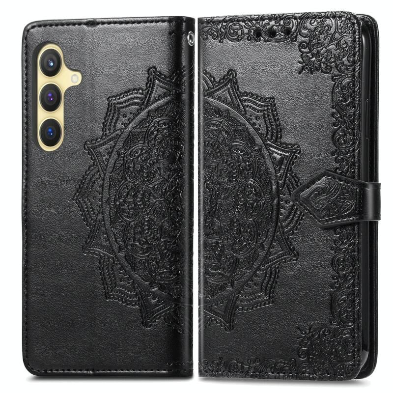 Για Samsung Galaxy S25 5G Mandala λουλούδι ανάγλυφο δερμάτινη θήκη τηλεφώνου (μαύρο)