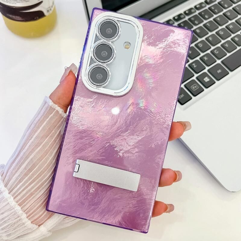 Για Samsung Galaxy S25 5G Επιμετάλλωση Glitter Υφή Πτυσσόμενα κάτοχος TPU τηλέφωνο υπόθεση με ταινία φακού (μωβ αλουμινόχαρτο υφή)