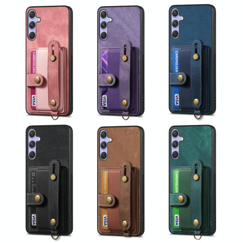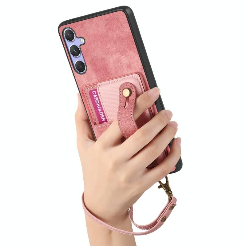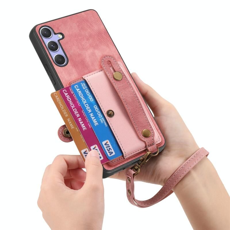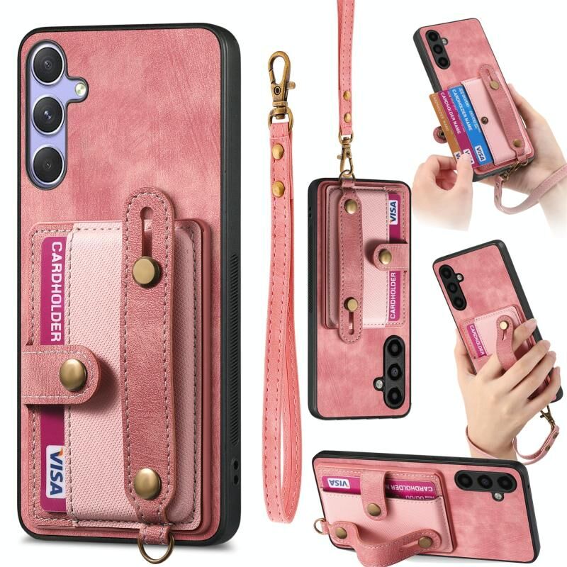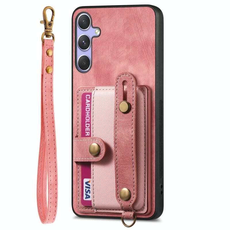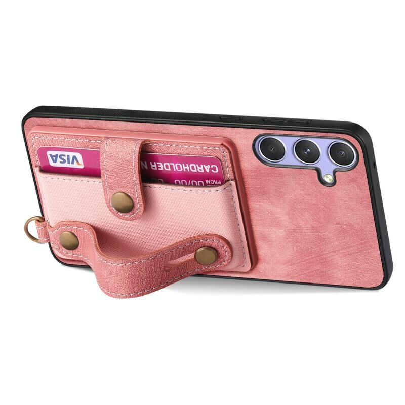 Για Samsung Galaxy S25+ 5G Ρετρό Σταυρός Wristband πορτοφόλι δέρμα πίσω υπόθεση τηλεφώνου (ρόζ)