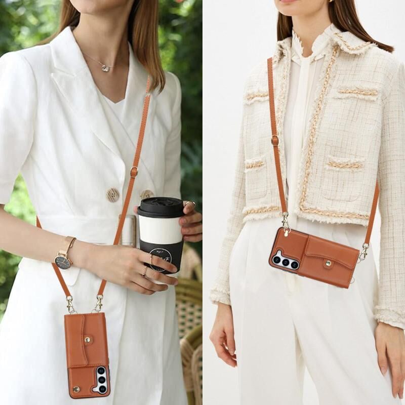 For Samsung Galaxy S25 5G RFID Card Slot Phone Case with Long Lanyard(Brown)