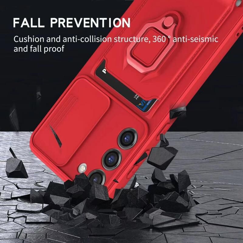 Θήκη κινητού τηλεφώνου Samsung Galaxy S25+ 5G με ολισθαίνουσα προστασία κάμερας, μαγνητική θήκη καρτών και σιλικόνη (Κόκκινο)