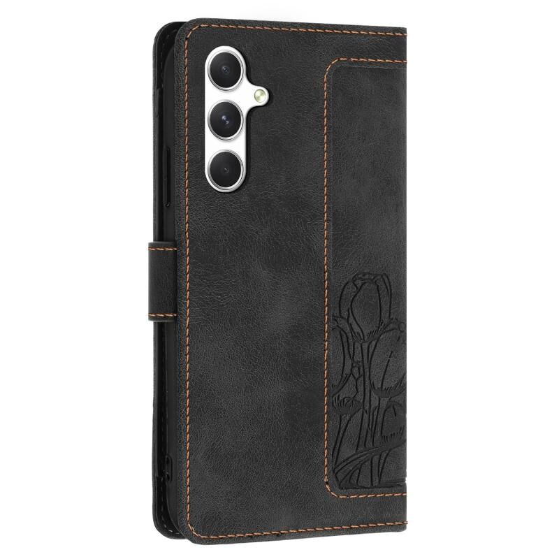 Θήκη τηλεφώνου Samsung Galaxy S25+ 5G από δέρμα με ανάγλυφα τουλίπες με κορδόνι (Μαύρο)