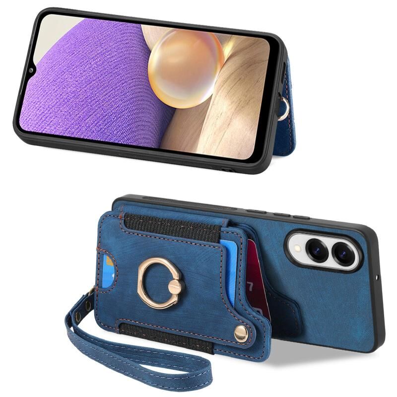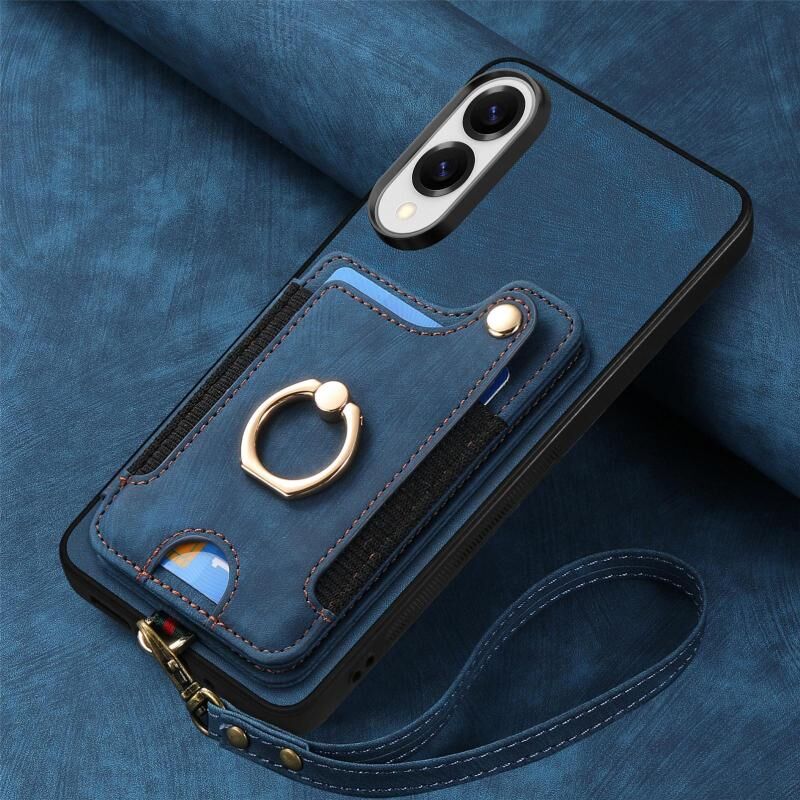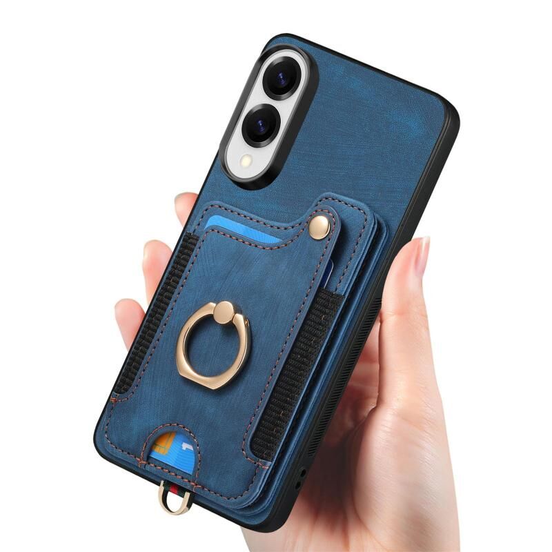 Θήκη τηλεφώνου Samsung Galaxy S25 Edge 5G με ρετρό υφή, δακτύλιο και πολλαπλές θήκες καρτών (Μπλε)