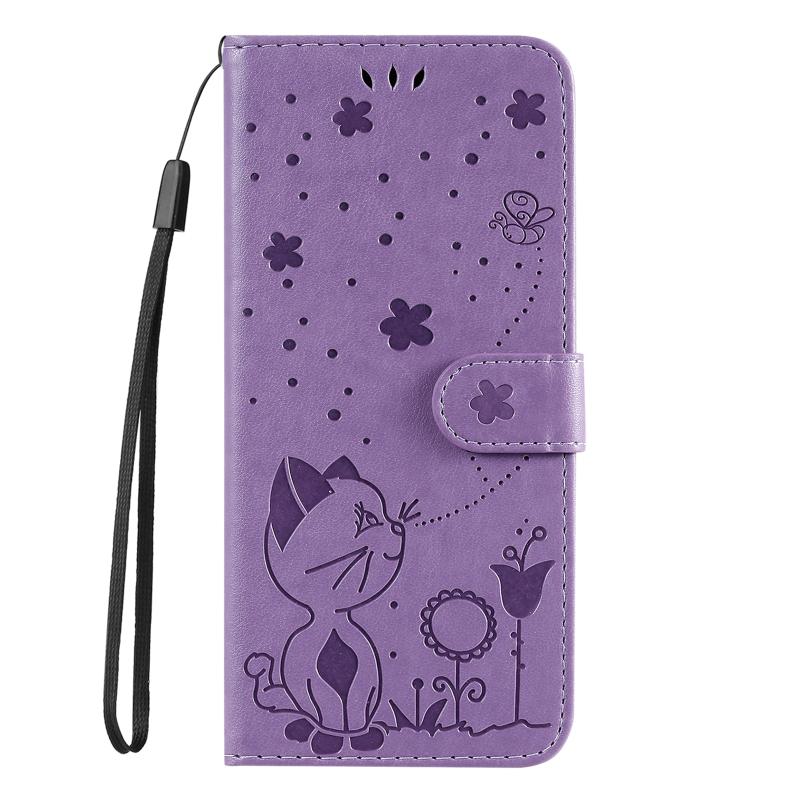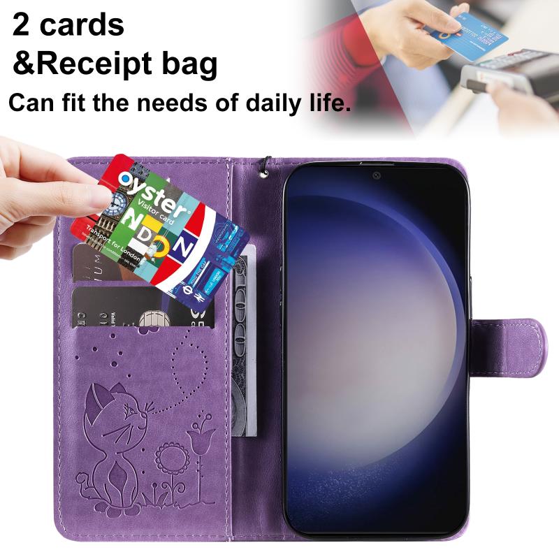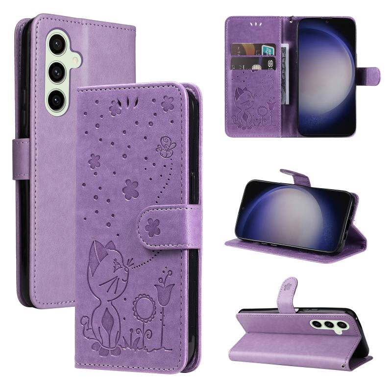 Θήκη τηλεφώνου Samsung Galaxy S25 / S24 5G, δερμάτινη, με ανάγλυφο σχέδιο γάτας και μέλισσας (Κόκκινη)