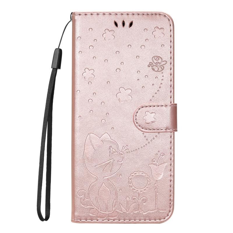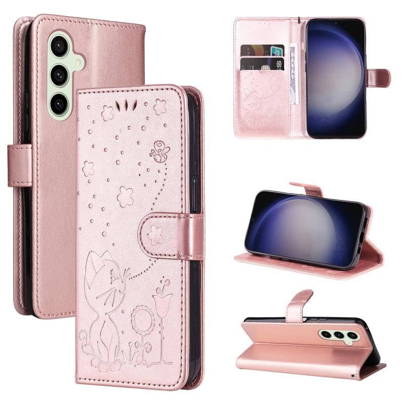 Θήκη τηλεφώνου Samsung Galaxy S25+ / S24+ 5G, δερμάτινη, αναδιπλούμενη, με ανάγλυφο σχέδιο γάτας και μέλισσας (Ροζ χρυσός)