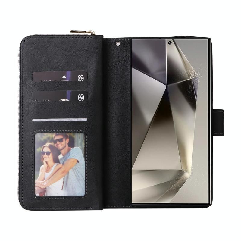 Για Samsung Galaxy S25 Ultra 5G 9-κάρτα υποδοχές φερμουάρ πορτοφόλι τσάντα δέρμα τηλέφωνο υπόθεση (Μαύρο)