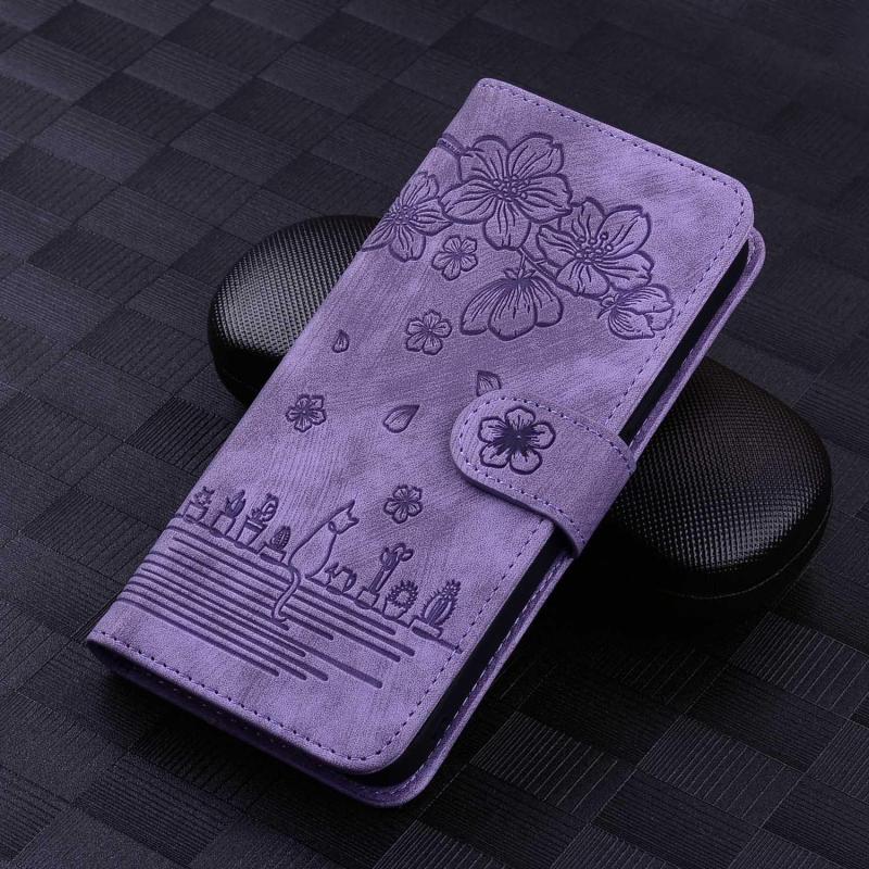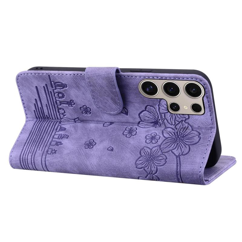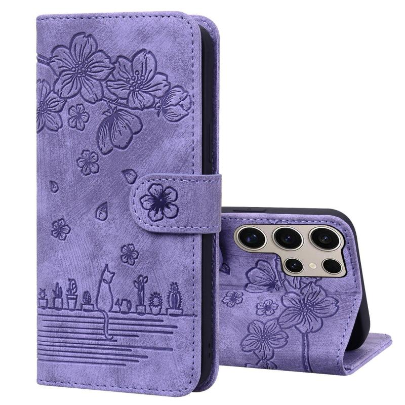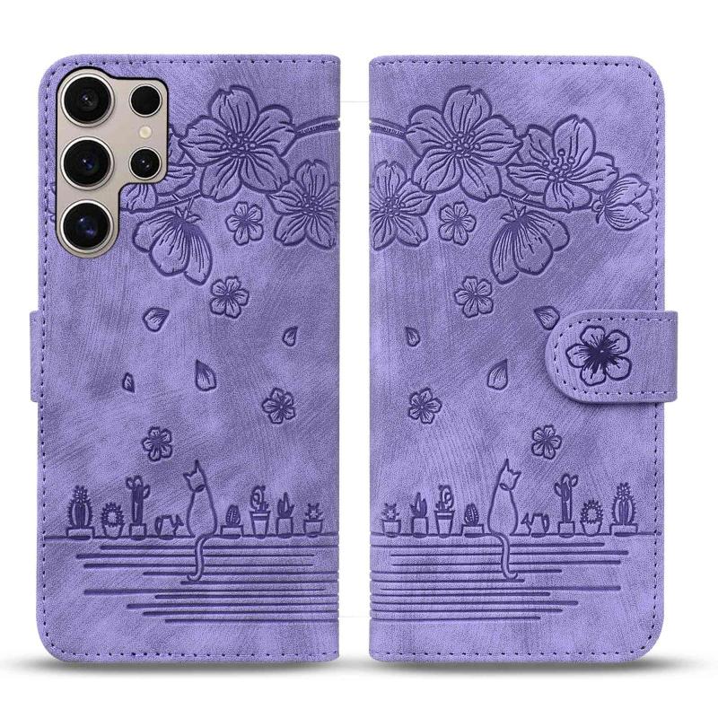 For Samsung Galaxy S25 Ultra 5G Cartoon Sakura Cat Embossed Leather Phone Case(Purple)