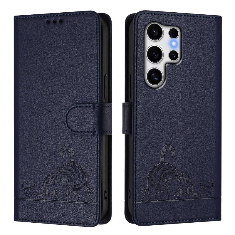 Θήκη τηλεφώνου Samsung Galaxy S25 Ultra 5G με ανάγλυφο σχέδιο γάτας και ποντικιού, από δέρμα με προστασία RFID και λουρί (Μπλε)