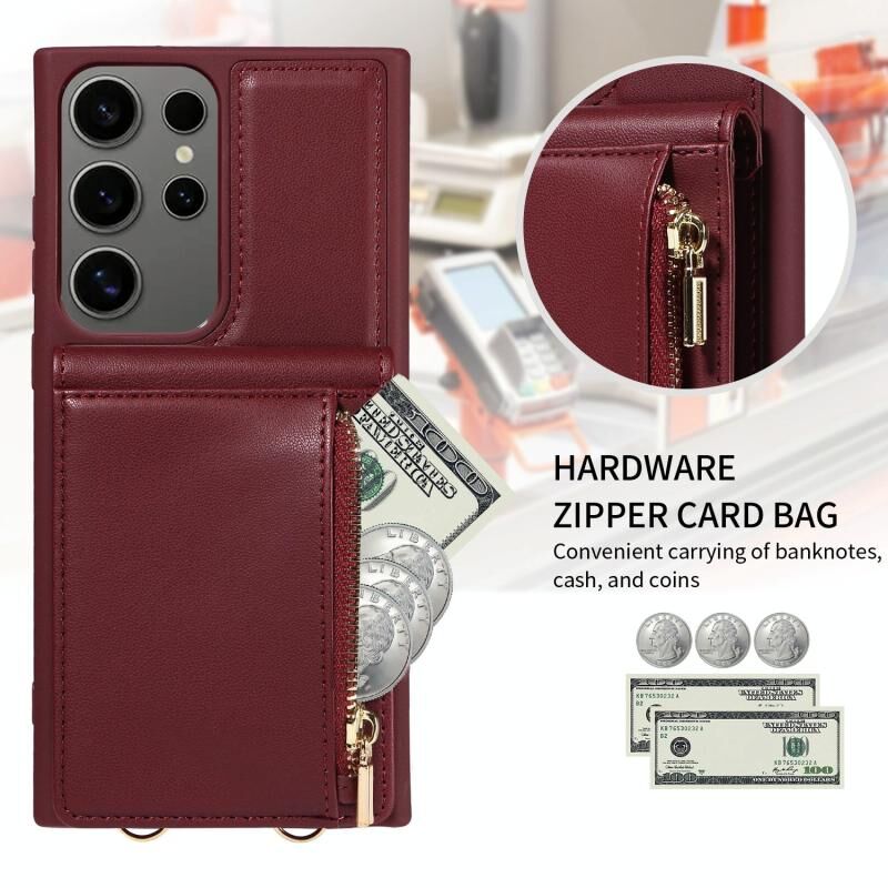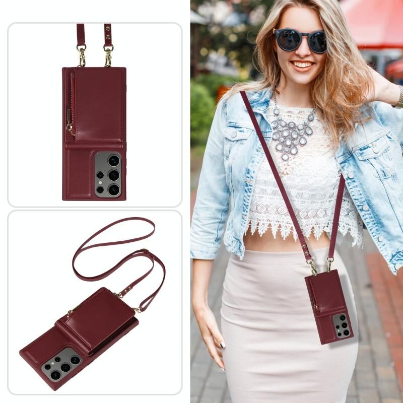 Για Samsung Galaxy S25 Ultra 5G Crossbody Lanyard φερμουάρ πορτοφόλι δερμάτινη θήκη τηλεφώνου (κόκκινο κρασί)