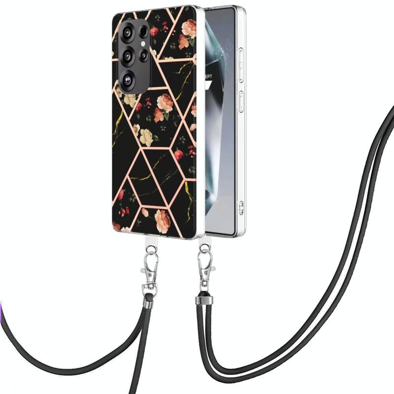 Θήκη τηλεφώνου Samsung Galaxy S25 Ultra 5G με επίστρωση ηλεκτρολυτικής επιμετάλλωσης, συνδυασμό μαρμάρου και λουλουδιών IMD TPU με κορδόνι (Μαύρο Λουλούδι)