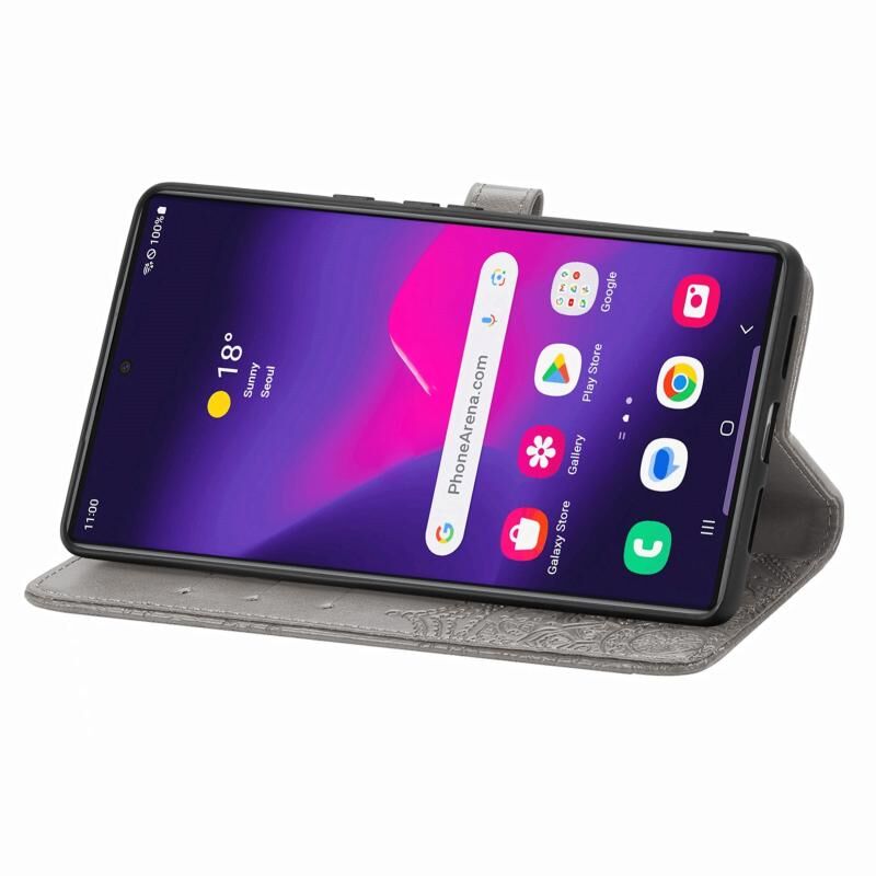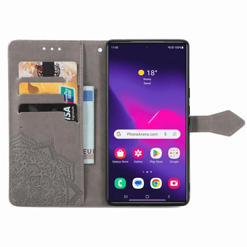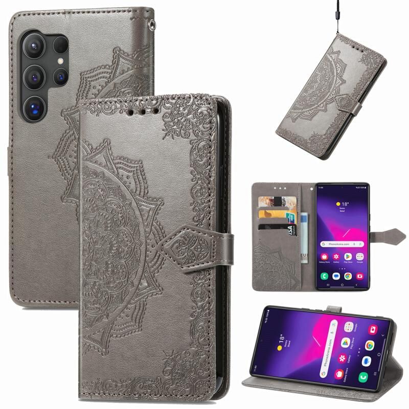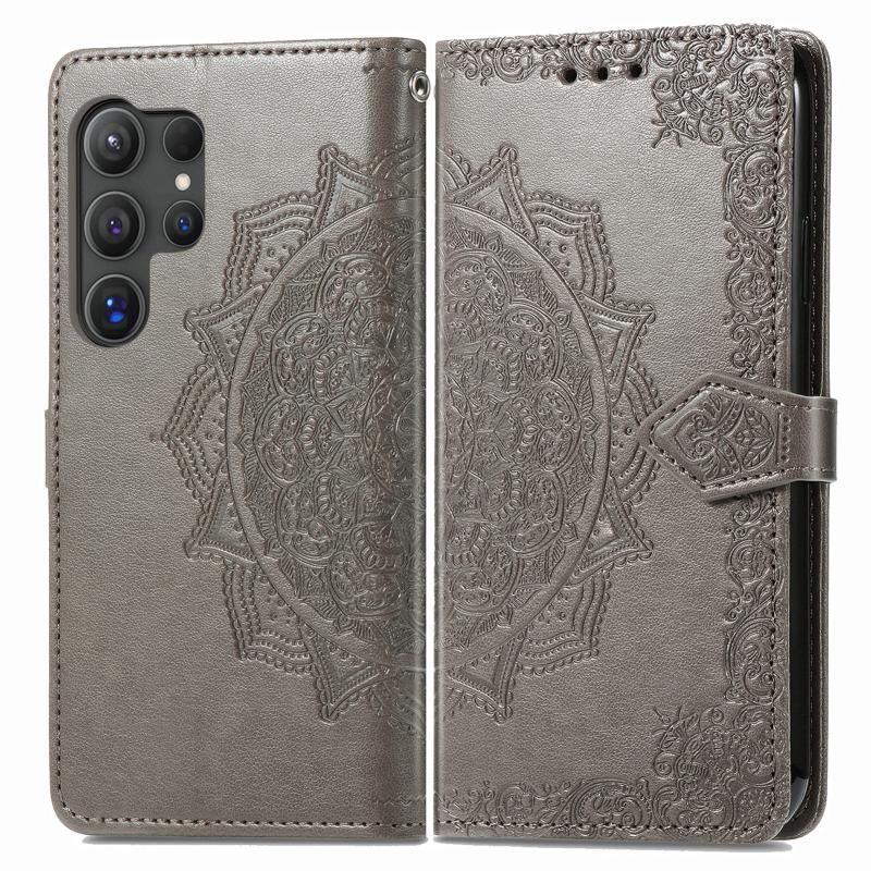 Για Samsung Galaxy S25 Ultra 5G Mandala λουλούδι ανάγλυφο δέρμα υπόθεση τηλεφώνου (γκρι)