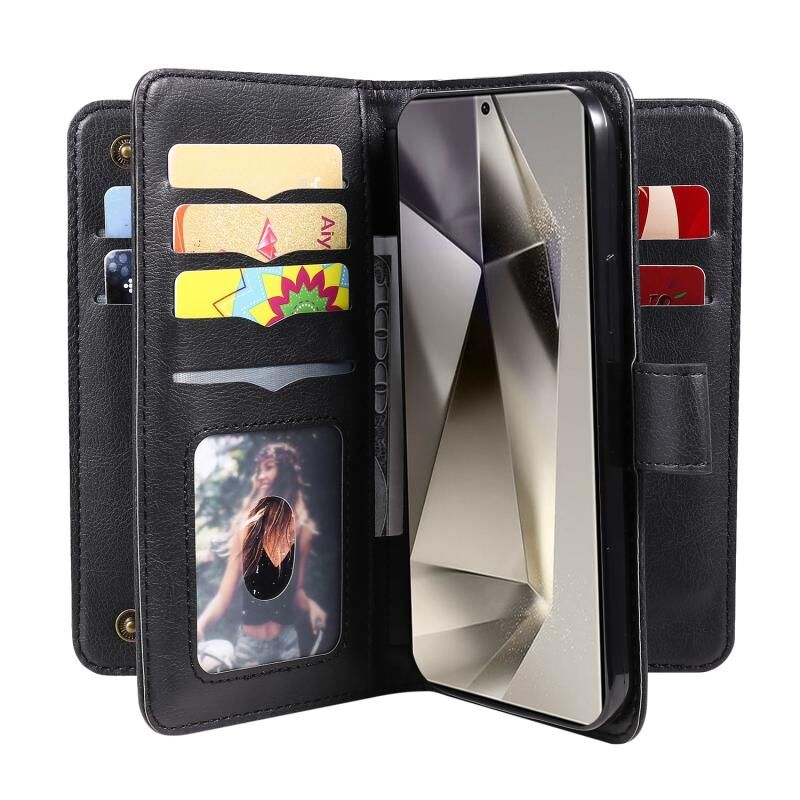 Για Samsung Galaxy S25 Ultra 5G Πολυλειτουργικό πορτοφόλι 10 υποδοχές για κάρτες Δερμάτινη θήκη τηλεφώνου (Μαύρο)