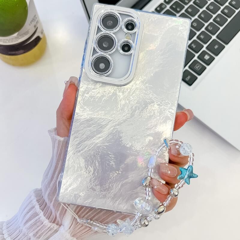Για Samsung Galaxy S25 Ultra 5G επιμετάλλωση Glitter υφή αλυσίδα Wristband TPU τηλέφωνο υπόθεση με φακό ταινία (Λευκή Υφή Αλουμινόχαρτου)