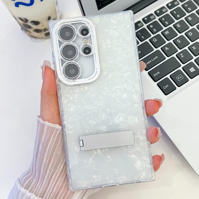 Για Samsung Galaxy S25 Ultra 5G Επιμετάλλωση Glitter Υφή Πτυσσόμενα κάτοχος TPU τηλέφωνο υπόθεση με φακό ταινία (Λευκό μοτίβο κοχυλιού)