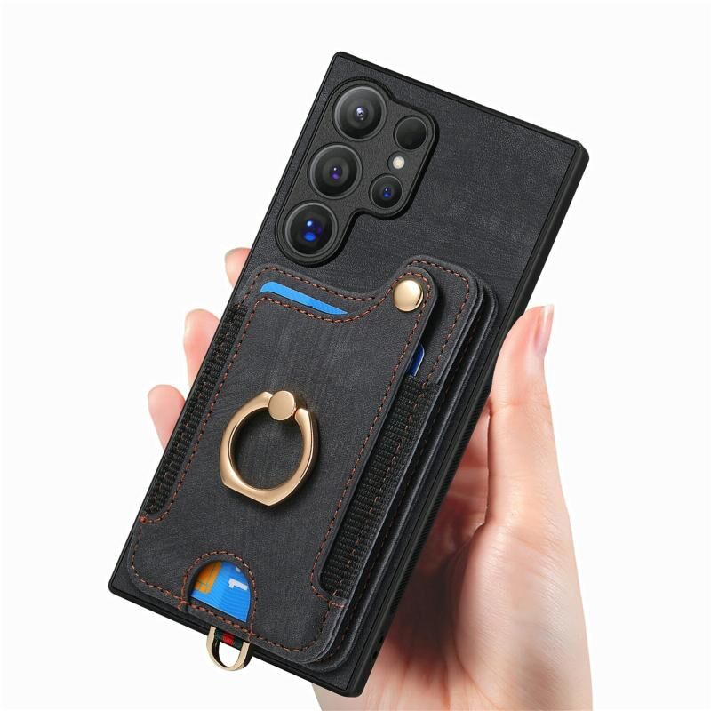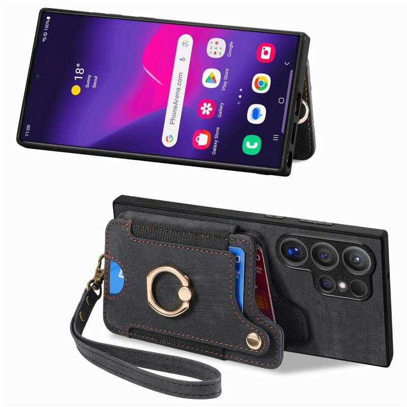 Για Samsung Galaxy S25 Ultra 5G Retro δέρμα-άισθησης δαχτυλίδι πολλαπλών καρτών πορτοφόλι υπόθεση τηλεφώνου (Μαύρο)