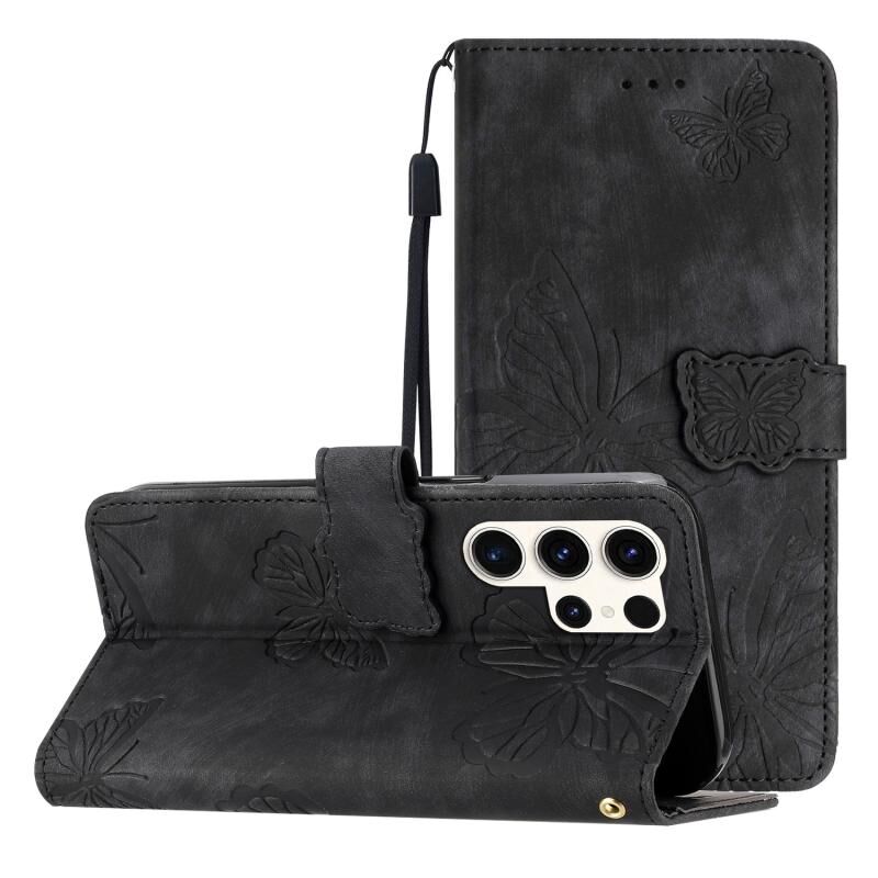 Θήκη τηλεφώνου Samsung Galaxy S25 Ultra 5G από δέρμα με ανάγλυφο σχέδιο πεταλούδας και αίσθηση δέρματος (Μαύρο)