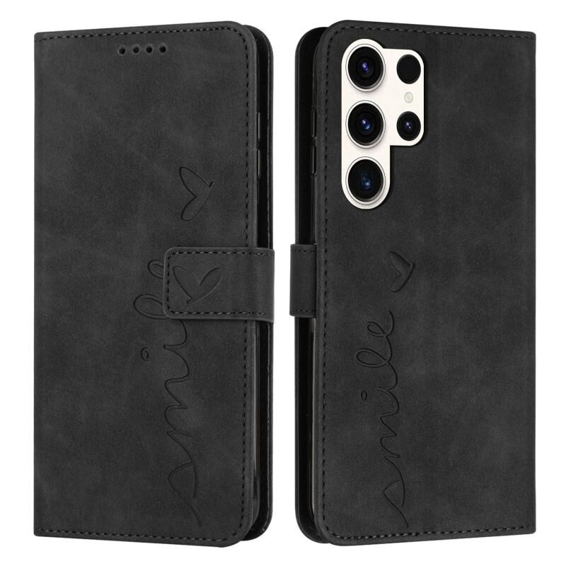 Θήκη τηλεφώνου Samsung Galaxy S25 Ultra 5G από δέρμα με ανάγλυφο σχέδιο καρδιάς και αίσθηση δέρματος, με μακρύ κορδόνι (Μαύρο)
